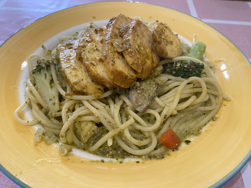 義式青醬雞肉義大利麵: 聞起來和吃起來都是自己買過的青醬罐頭,那個青醬罐頭屬於重口味且好吃的味道,不過這邊調得比較稀,如果可以稠一點會使整體更濃郁好吃些。雞肉口感就是舒肥雞,咬下去會有一點點脆感,其實個人不太喜歡這種雞肉,但這就是因人而異。