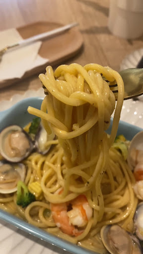 餐點: ⭐️安舍料理 💕奶油海鮮直麵💰220 美味等級🌕🌕🌕🌕🌕 有三種選擇的主餐澱粉(直麵、筆管麵、燉飯)元元我選擇直麵,直麵的口感非常好吃Q彈,用料實在,蝦蝦大隻口感新鮮脆度夠,蛤仔大顆鮮美,搭配著原本的奶油香氣,花椰菜、玉蜀黍及洋蔥的加入,顯得更加有風味,吃完不會太膩口,超好吃😋