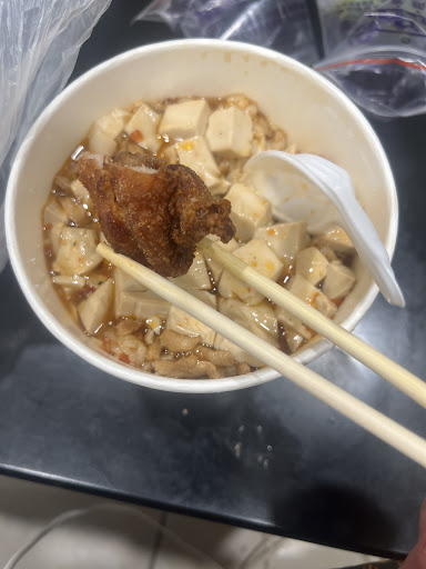 我點了麻婆豆腐跟炸雞腿排,以下是我的感想: 1.麻婆豆腐: 我點之前有看過評論,老闆有說過香料都是四川帶回來的,不過⋯不論是聞起來還是吃起來,這味道我實在無法接受,這香氣有種特殊香料的味道,我聞了會想吐,吃起來又甜甜的,類似有加番茄醬的味道,真的無法接受,我吃一口就真的沒辦法再吃第二口,只好倒掉,而且飯應該與麻婆豆腐分開裝,才不會讓飯將湯汁吸乾,不過味覺是主觀的,因為也有人覺得好吃,我的話⋯只能說聲抱歉。 2.炸雞腿排: 一看到炸出來顏色我就更擔憂,吃起來⋯的確完全不合格,肉質普普,而且炸的太過。
