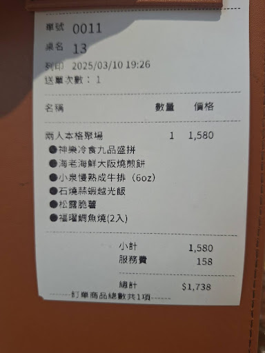 Read more😡誇張的作業流程令人不敢恭維 點了雙人餐點1580含一成服務費1738 晚間18:50完成Qr code點餐 第一道餐點海鮮大阪燒 第二道餐點松露脆薯 第三道餐點慢烤熟成牛排 第四道餐點紅豆鯛魚燒出餐時間約19:30,(心想覺得奇怪冷食及石燒飯不是應該先上,怎麼甜品先出了) 直到超過了半小時20:09詢問石燒蒜香越光飯及神樂冷食九品盛拼怎沒上菜,才回覆因疏失所以沒有製作。 人手不足可以諒解,但內部流程明顯犯了非常驚人的疏忽,比我們後面進來的客人都已吃完並結帳離開,而且他們的點餐時間比我們晚,為什麼帳單上key單的時間比我們早? 我們18:50完成點餐而且是QR CODE點餐,為什麼帳單上Key單的時間是19:26,還比後面進來的客人還晚。 內場外場沒有一個人發現我們少了兩樣餐點,還是電腦系統Qr...