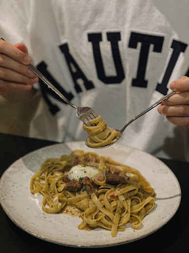 -牛胸肉義大利麵- 麵體是寬體的 上面有顆溫泉蛋 醬不知道是什麼醬 但是吃起來後面帶點酸味 牛肉切成小塊小塊的 口感上比較有嚼勁 我覺得這道好好吃 🤤