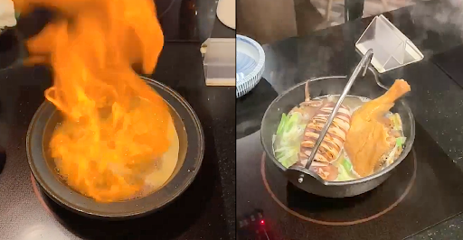 #燒酒烏骨雞蛤蠣鍋 這個湯底是狂一鍋除了套餐之外最貴的,不過用料也很實在,有米酒、烏骨雞肉塊、一碗大顆新鮮蛤蠣,烏骨雞先炒過爆香後倒入一整瓶的米酒點火讓酒精揮發,最後再加上中藥材直接煮開,濃濃的藥膳味天冷來上一碗身子都暖起來了。因為米酒點火燃燒了快一分鐘,讓同桌的侄子和小侄女看呆了,說吃火鍋從來沒看過火,這次終於看到什麼叫做「火鍋」了吧!