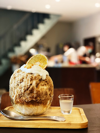 點餐的時候,店員介紹刨冰的種類,還有刨冰的吃法。我們點的是B52調酒刨冰,刨冰本體是用威士忌糖漿淋上,刨冰的頂端蓋了一層起司奶蓋灰常好吃。還有在奶蓋上面插上可以啃的烘乾的香橙切片。還很貼心的準備了一杯橙酒在旁邊,味道不夠可以倒。