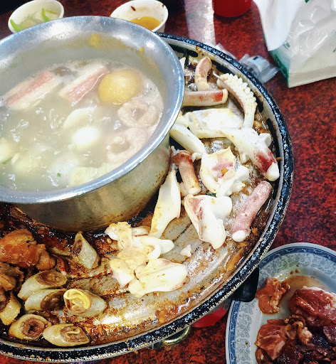 之前路過就一直很感興趣,趁著天氣冷就來吃了~ 是一間很傳統的餐廳,紅圓桌、吊扇、貼滿牆壁的照片、菜單及標語,自開式冰箱裡擺滿菜,還有白飯、雞蛋、麥茶可以自取! 我是第一次吃火烤兩吃,看到鐵盤+火鍋的組合真的是很有趣,用瓦斯爐加熱就能一邊烤肉一邊煮火鍋了🥰 因為是鐵盤,所以更像是蒙古烤肉的烤法~ 老闆很親切,很熱心地分享怎麼煮怎麼吃,親自幫我們烤了雞心及鴨腸,還教我們怎麼用鐵板炒肉🤣 老闆娘後來還過來跟我們說可以炒泡麵!可惜吃太飽了沒有嘗試,但真的很有趣。