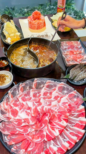 點了牛豬豪華雙人餐,肉量超浮誇.ᐟ.ᐟ 經典的爆炒石頭鍋每次都會選,湯頭爆炒的很香,很好喝ςʔ炒過的豬肉也是特別Q 川府麻辣鍋會先用辛香料炒過,入口很溫和,辣感會慢慢上來♥♥ 搭上自助區的鴨血、豆腐很適合,附食也很豐富⸜♡⸝
