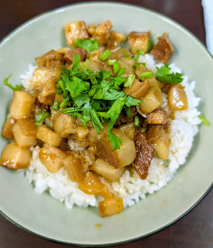 肉燥飯(小碗):上面有一塊腿庫是老闆送我的😅(因為我本來點腿庫結果只剩一小塊而已所以直接送我),他們的肉燥是屬於肥肉居多跟白飯攪拌一下整體品嚐起來不會有膩口的感覺👏,肉燥當中帶有濃厚的胡椒香氣讓整體的風味更佳提升👍👍。