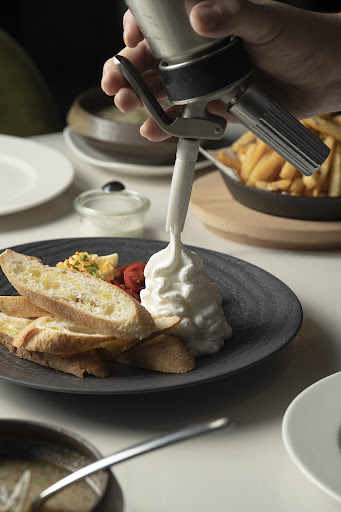.香脆法國麵包搭乳酪烤蛋與番茄沙拉 NT$ 210 烤過後的法國麵包外脆裡香,法式雞蛋再抹上乳酪慕斯醬,直接掉入柔滑的布拉塔起司醇香的漩渦,飽滿細膩的搭配非常適宜,在品嚐兩道餐點後,也讓人對後面的菜色充滿期待感