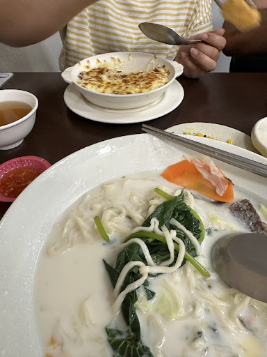 🍜牛奶蔬菜麵(QQ麵) 另外加地瓜葉、素米血、海帶卷 牛奶的湯頭感覺真的是用喝的牛奶 因為湯頭會甜甜的 但整體喝起來不會很怪 蠻順的 看旁邊的客人點的 一半都是麵 麵體的部分有很多可以選擇 QQ麵就是細麵 不會煮的爛爛的 還不錯! 蔬菜麵有很多配料可以自己選也可以選不要麵~