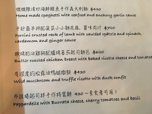 Read moreBeen here a handful of times, gotta say the service is spotty and menu items are hit or miss. Stick to the pasta, usually pretty safe with pasta, sometimes even brilliant. Skip the duck risotto. Got the lamb with Spatzle, spatzle was mega salty, dropped a piece of lamb on it and it turned super salty. Finally got a servers attention and they got the chef to remake the spatzle, this time "no salt at all". Sparkling water kept with the wine, served Luke warm. Having been to both locations, Kenting and here, I've decided that you're better off taking that drive to Kenting and eating at...