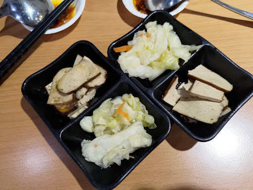 候餐時看了一下餐具醬料區 店家提供了: 辣椒醬、油潑辣子、麻辣醬、醋辣椒、醋、胡椒粉..等多種調味料可供選擇 我拿了一小碟辣椒醬跟一小碟油潑辣子混搭麻辣醬