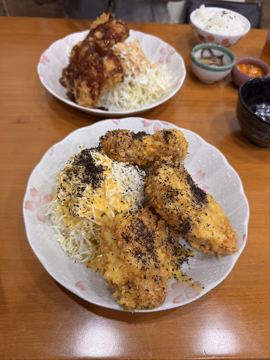 二、主菜。 令我印象比較深刻的還是每週限量20份的唐揚雞套餐,WTF?? 雞應該比豬跟牛還好取得吧,怎麼還會每週限量20份。 當唐揚雞端上桌時,你才會知道說喔,這一塊大小大概等同於你在超商買一塊59元微波的雞胸肉,對了!視覺上看起來比較小,因為超商的是長條形,而唐揚雞比較厚但比較短。 一口咬下是會爆汁的那種,沒有冷凍過後的口感,雞肉飽滿有水份,Q彈且有咬勁,而且每一塊在上方都有自己的醬汁,像炸牛排就是。 但這是優點,也同樣可能會是個缺點就是,像我個人是屬於原味派,只灑鹽巴,不做任何調味,連高麗菜也是有淋上芝麻醬。 你說這樣會變得不好吃嘛?倒也不會,三種都有不同的口味也是很棒,只是我更喜歡只灑鹽就是。 調味料跟口味,這種就太因人而異,但論就食材的本質,絕對是好的,吃完了並不會覺得這400元白花。 未來有機會還是會再來用餐,換吃豬排吧。