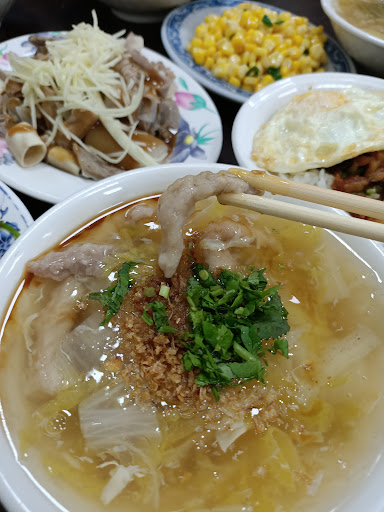 假日下午1點多仍然大排長龍,前面幾個點餐都有喊到:肉燥飯、肉焿、半熟荷包蛋、玉米,就跟著點了這些😋。肉燥飯的米粒很香,飽滿且粒粒Q彈,淋上的肉燥油而不膩,肉塊比較大口感較有嚼勁。肉焿是用條肉處理,軟嫩適中有醃過的醬油清香不黏牙,湯內給了很大片的大白菜,甜味就是由最自然的油蔥酥和香菜帶出香氣,淋上一點烏醋,整口溫潤飽滿,搭配肉燥飯是絕配。