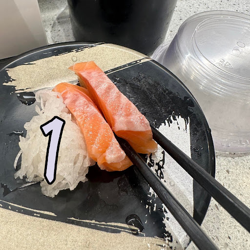 About three to four different types of sashimi. Salmon, tuna, yellowtail and marlin. However only the salmon was available for order rest you have to get off the belt. Sashimi slices are also very small in portion for its price but is fresh.