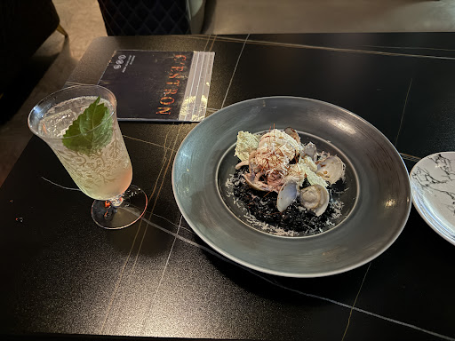 辣墨魚燉飯—大量奢華的番紅花和現刨起司的香氣撲鼻,有蝦餅增加層次感,蛤蜊非常大顆飽滿,最關鍵的燉飯米飯選用的澱粉含量也恰到好處,可惜小卷(或中卷)是冷的,部分食物溫控不足,且已成年男子來說,份量稍嫌不足,不然我覺得整體調味還不錯!