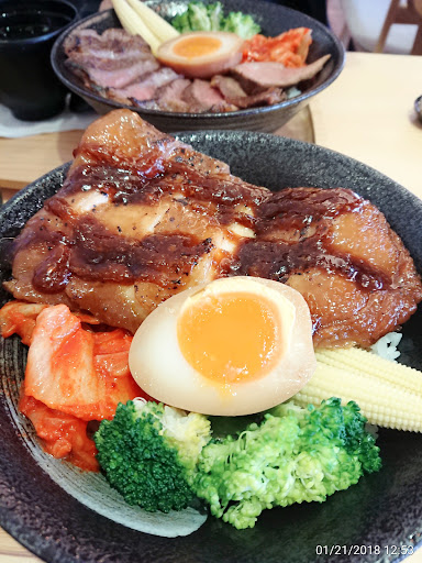 種類蠻多的 丼飯餐是肉片做成的丼飯 原塊肉就是一塊一塊的了 看自己喜歡吃哪種 我這次點的是日式冰魯雞 點一份還送湯跟小菜真的是滿佛心的 不過出於習慣還是另外加點了糖心蛋跟可樂✌️