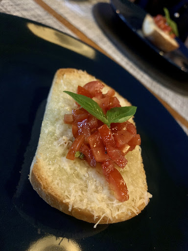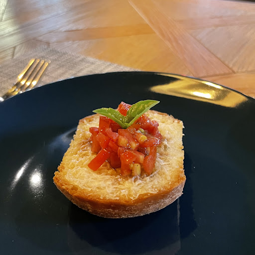 🥖開胃菜:蕃茄乳酪佐甜羅勒烤麵包 一入口是脆麵包加上淺淺一層的乳酪,淡淡奶香又不會太乾,後段衝出味蕾的是番茄和羅勒,兩種食材味道很突出,但又不會突兀,這組合意外的很搭!整體來說酸甜不膩、口感豐富、創意新奇。