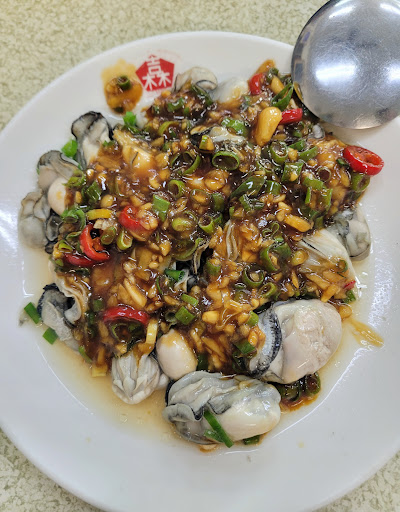 一進到裡面,慌了!!!每桌都好大 人滿滿 服務人員很多 等位置的同時觀察到:桌距間極寬 冷氣很冷 每張椅子都是很大座面的大沉重木椅卻不會和隔壁桌椅子互碰 服務人員速度快每個人很忙都沒有不耐 態度好 會依照人數決定大中小盤 會被說已經點螃蟹粥了捏還要點白飯???🤣 阿就好想要北崩啊啊啊啊 👍蒜泥蚵:哇!第一道上面潑的醬就已經想吃北崩 大量蒜末蔥末微辣椒末+特調不死鹹醬 ,蚵仔每顆攏周大my 嘟傻賀起來潑醬 還能吃到蚵仔溫熱嘟嘟賀熟的肥美嫩 第一道就這麼想來北崩那怎麼行 👍干貝:點菜時 有先詢問是如何烹法 她說要煎的或炸的 天真的以為煎的就像鐵板燒乾煎的 不是捏 它是被煎後 再和少許青紅黃椒拌炒黑胡椒 原本是不喜歡黑胡椒的 但一吃只覺得自己太井底之豬 調味之精準 黑胡椒的單純香氣 干貝的彈度 這道就像是在吃個海鮮的小零食 一口一顆 干貝的數量心滿意足 👍那個魚:炸酥的 那個魚沒吃過ㄟ 好燙一咬下去好綿 外層粉漿不得不說:這種外皮通常一吃都很含油 吃一兩塊就覺得膩噁 再次強調這家的調味手法太強,粉漿完全不油膩 粉漿甚至有點甜甜奶香 再沾附上的蕃茄醬或胡椒粉 超好吃的 👍紅燒魚:選了一尾中型魚 名稱不懂 只要會吃就好🤣 請她們用紅燒(醬油糖的,因為東港所謂的紅燒是糖醋,所以有先溝通是要醬油糖的)哇哇!好美的這道菜 先試醬,哇靠已經用到哇靠 超讚古早味的醬 真心覺得下次點這道必須每人三碗北崩 一般喜歡的紅燒是魚要煎恰香再紅燒汁 這家的是沒煎恰 反而是整尾直接入醬煮熟 覺得那ㄟ無煎恰一吃時懂了 肉細又彈實 煎恰似乎不能懂這尾魚的 醬汁的完美提高這尾魚在這輩子提供它肉體給人類營養的價值🤣 👍螃蟹粥:小的就很大盅 趁燙快來一碗暖暖胃 啊啊啊啊啊啊超好吃的 湯濃 米密香 這個不純粹只靠螃蟹下去煮的味道 吃的出高湯當底去燉去讓米黏糥密 米湯的潤厚 調味過度精準 好好吃啊啊啊啊啊啊 裡面螃蟹不大很新鮮很新鮮 殼不硬 好咬 當然吃不完 外帶竟還很貼心附一包高湯讓客人回家再加入加熱吃 再有一點 胡椒非常香 👍魚翅羹小:竟看到別桌出菜疑似魚翅羹 不點怎麼行 菜很多吃不完 有什麼關係 再打包就好呀~料滿滿的古早辦桌羹 上面胡椒超好吃 它的香不是用聞的是吃到覺得這家使用的胡椒不同 聞不太到卻吃起來很不同(不是那種一吃就覺得是中藥味重) 魚翅羹非常合口味 醋已先入羹不需要再加醋 吃到這裡完全沒有一樣是普通 都是上乘。 👍蝦:兩個人她給四尾 鮮彈 在蝦身微彎曲的一剎那就起鍋 熟度是最完美。給的薑醋醬很足夠又好吃,竟然想喝它🤣 👍甜點:白木耳甜湯+小玉西瓜 哇賽第一次遇到海產店還給甜湯加水果 一般都是只給一種甚至都沒有。 ㄟ~ 這家把客人拉進來的手段相當高明:白木耳很好喝 甜香度到達卻又不過度甜膩 連小玉西瓜的品質都很好 甜又細 這次是讓我們從頭到尾每道菜每個小細節每個食材甚至胡椒黑胡椒都稱讚到 吼 是怎樣啦 還要不要給人去別的地方吃啦 再不得不稱讚的是:忽然打去訂位 他雖有勉強接但因為塞車開錯路等種種以致遲到 現場雖滿座 他有說可以和人併桌嗎 當然可 但是他們很尊重顧客 竟再喬出一整桌給我們坐 旁邊有兩個都是一個人用餐竟都一人一個10人桌 都沒讓彼此去併桌 他們都是去單純的吃一份炒飯或炒麵配一份炒菜 店家的態度令我心服口服 尊重每一個進來的不管他只點了什麼的客人。用餐期間健孝提出的問題 她們很忙當下她們不懂的會說你等我一下我問...