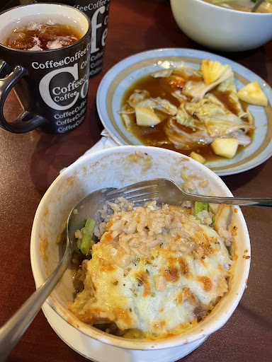 老闆:第一次來嗎? 我:第二次。 老闆:那應該不用再特別介紹了。 我:(微微一笑,心想上一次來已經是十年前了)。 感覺店面外型及內部裝潢與十年前大同小異。 店家位於透天厝一樓,門口用許多盆栽綠植裝飾,在門前的戶外雅座用餐,應該會略有身處花園野餐的感覺。 進到店內會以為這是一間附設商業簡餐的咖啡廳,或是一間泡沫紅茶店(民國80年代風靡一時,以茶飲為主,簡餐點心為輔的複合式餐飲店) 我點了一份焗烤麵,餐點送來後,感覺有多處與日常經驗違和的衝突感,以焗烤麵為例,經驗裡大多是用深盤盛裝,店家用的盛具類似於小碗公,再者,印象中焗烤麵多半用義大利麵的麵款,口味也較為西式,店家用的是中式粗麵條,烹調口味也較臺式。 吃著吃著喚起10年前感覺餐點CP值不高的印象,應該也是源於那些與經驗違和的衝突,話說我竟然跟十年前一樣點了焗烤麵,人的習慣愛好實在很難改變😂。