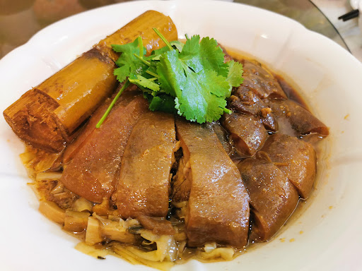 跟旅遊團來,點了經典客家風味套餐,裡頭有7菜1湯,還有兩個主食(地瓜飯、炒粄條)及水果跟茶飲,其中主打的碳燜豬腳,口感相當軟爛好入口,而下方還有搭配筍絲,但整個味道有些過鹹,雖是很好下飯的一道菜,但並沒有讓我覺得很驚艷,就還行而已,可惜了~