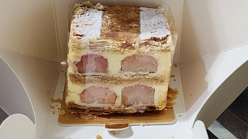 走入店內有觀看一下蛋糕櫥窗裡的品項,看起來蛋糕價位落在95~130元。 我點了草莓拿破崙及巧嵐娜千層,外帶回家吃草莓拿破崙蠻好吃,但餅皮很硬,刀子切下去,蛋糕也崩解了😅,巧嵐娜千層還沒吃,但看起來也是很誘人。