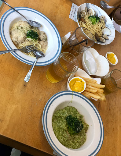 -香蒜蛤蜊義大利麵(推) 這個醬清爽好吃,蛤蜊大顆沒有味道! -青醬雞肉燉飯(推) 青醬很香推推,雞肉好吃。 -白醬雞肉義大利麵 白醬也是不錯,不過如果自己吃可能會膩,想點白醬建議大家分著吃。 -香茅五花肉燉飯(不推) 肉太鹹了哈哈哈,沒什麼香茅味,不用講太多是全部裡面最不喜歡的。如果完全不吃辣不要點,飯有一點點辣,我是覺得只是提味的那種。 -薯條粗粗的好吃,醬好像有咖哩味還可以,不過熱熱的薯條配冰冰的醬有點怪哈哈哈