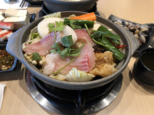 Read more海陸雙絕(海鮮+雪花牛腹肉)1099、雙人開嗑(氣冷雞+白蝦+美國霜降牛)1099。(以上皆須加一成)。湯底選黃金昆布+蔬活元氣(二者皆不用加價)。會員贈送活力梅花豬一份。 湯底清淡不搶味,算是稱職的火鍋湯。視覺效果營造得很好,海鮮盤上桌讓人眼睛一亮🤩,新鮮度一般。霜淇淋口味特別(靑蘋果、北海道牛奶),好吃👍。醬料檯選擇不少,可調出好吃的沾醬。有氣泡水去油解膩。服務人員態度和氣,用餐尾聲主動詢問是否需要幫忙去蝦殼?第一次在火鍋店遇到額外服務,印象深刻。 以下是減一星理由: 1.桌面太小。當天四人共鍋,沙發夠坐但桌子不夠用,桌邊的肉盤架又太大,只能放霜降牛,海鮮、氣冷雞、白蝦、梅花豬全都得放在桌面上,加上自助吧專用的盤子兩個(第一次遇到四人用餐只給兩個盤子的狀況,也是受限於桌面大小嗎🤔)?桌上標配個人用碗盤、公用火鍋夾勺瓢、餐巾紙、垃圾桶,再加上沾醬,一整個擁擠到不行,所以吃一頓飯得不停變換各種餐具位置,很累😮💨。 2.肉質不佳。肉片得很薄,霜降牛無法一片片夾取(碎裂),只能一坨一坨丟;神奇的是肉片已經這麼薄了,梅花豬的筋依舊很有存在感😑。 3.冷氣不強。可能是個人座位比較後面也比較偏僻,覺得冷氣很弱,大概就是靜靜地坐著可以但吃東西會覺得熱的程度。 4.冰淇淋挖勺放在不流動的水中。挖勺澡堂混濁不堪,觸目驚心😱,挖勺守護了冰...