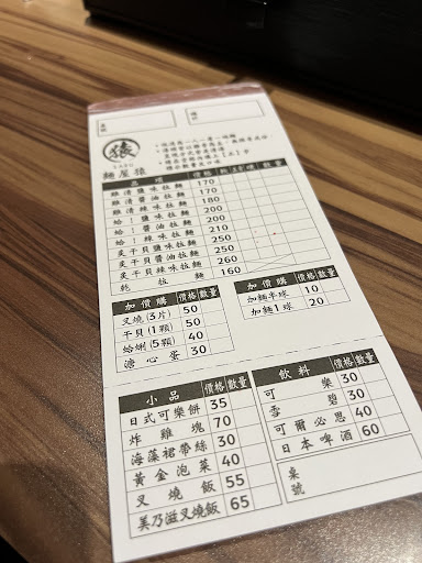 Read more總共點了醬油干貝/蛤!鹽味拉麵,等兩款拉麵,配置多了3片叉燒/一顆干貝。 另,美乃滋叉燒飯一碗、唐揚雞、可樂餅 可爾必思、可樂等共770 先下結論,這家店我願意再回訪,但感覺店家還沒有完全摸索出想呈現的完全體。 醬油干貝拉麵: 湯頭表現普通沒有明顯記憶點,但保有醬油拉麵一貫的清甜,紫洋蔥碎末似乎與湯頭融合度較差。 麵體是非常棒的選用,店家很清楚自己的拉麵適合哪種麵體搭配上來說非常棒。 配料,干貝表現普通好吃但就一般可以想像得到的炙燒干貝味道、筍乾存在感太弱有點可惜,我很在意的海苔表現不太好,選用上並不是香氣很夠的海苔包覆麵體一起吃的時候味道不夠。 然後是叉燒,出發前看了很多評論,覺得店家的肉量的確較小,但實際入口之後很驚艷!我是一個不敢吃肥肉的人,但店家將肥肉區塊炙燒處理到剩些微焦香,入口只有脂肪化在舌頭上的口感並無一般肥肉讓人不舒服的口感與味道,非常棒,我願意每次來都多花50塊配置3塊叉燒肉! 但要注意瘦肉偏多的區塊略柴真的好可惜啊。 蛤!鹽味拉麵: 相同內容的部分就不贅述了, 湯頭鮮甜但非常可惜越喝越被青蔥蓋掉味道,建議店家在轉味配置的選擇可以再多多嘗試(例如青蔥不切碎末刨絲) 蛤蜊本身沒話說,飽滿大顆新鮮。