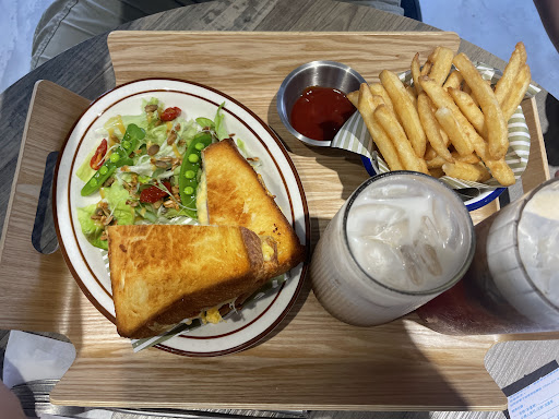 Read moreChill spot with cute ambiance. The drinks are so nice because they are actually not sugared 🤩 i got a tea and my husband a matcha coco latte which was very chocolatey but was hard to tell there’s matcha in there. We came here for a little snack. It’s self seating which is nice and comfy, and the staff was really kind and explained items and listened to requests. The grilled cheese was really flavorful and fries were crispy, we would like to visit again for other items. When we went at 4 pm ish it wasn’t too busy. The lighting...