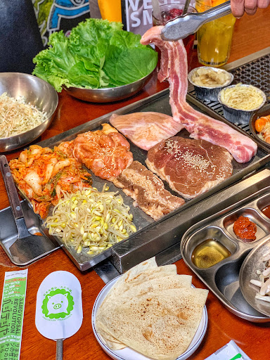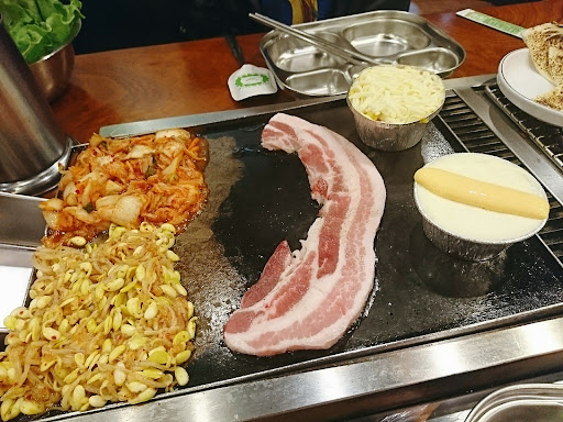 #名物上生三層肉 ➡️是厚厚一條原味的三層肉,烤完後服務生會先請我們用生菜加入從沙拉、泡菜、然後把肉沾上芝麻油後包進去一口吃下,吃下去口感相當清爽完全沒有油膩感,也沒有三層肉的肥,可能因為由都烤出來了所以吃不吃肉味,但那清爽噴汁的感覺完全不像再吃三層肉呀😍 #元祖刨刀三層肉 ➡️這個雖然也是三層肉不過不同的是把肉切成薄片,烤出來脆脆硬硬的,服務生也是幫我們把墨西哥餅皮+麻糬皮+孜然口味的番茄酪梨沙拉+醃過好吃的小黃瓜+沾上酸酸甜甜的“碰醋醬”一起吃下去,一樣味道十分清爽,而且麻糬不會甜有增加口感的感覺,整個吃下去完全沒有肉味就像是蔬菜捲餅一樣😂😂 👑#蔥醬三層肉 ➡️蔥醬味道其實沒有想像中恐怖但是蠻有味道的,直接吃就可以了只是綠綠的看起來有點恐怖而已不過味道還不錯 😋 👑#秘傳醬三層肉 ➡️秘傳醬一定要點而且我覺得是今天最好吃的口味!吃起來鹹甜甜地就像台式燒肉的味道,而且肉真的可以直接吃完全不油膩!非常推👍👍 👑#vege海鮮豆腐鍋 ➡️這大概是在韓式烤肉店中吃到最好喝的湯品了,味道一開始喝起來很日式,就像一般日式涮涮鍋的海鮮湯底一樣超好喝有點味噌的味道,裡面的配料也很大方的有兩隻蝦子、雞蛋、豆腐、年糕、蛤蜊、蔬菜,我的吃法是把蝦子拿去沾起司😍真的有種在吃海鮮焗烤的感覺喔😋😋 👑#濟州卿飯 ➡️吃完一段時間服務生就會來做炒飯了,份量約是一碗白飯,配料則是有香菇等蔬菜,加入濟州醬、蔥、蛋海苔等,炒起來很香,還可以選要濕的還是乾的喔~~全部炒完吃起來就是帶有水分又不會黏的好吃炒飯,還會有鍋巴的味道跟海苔的香氣呢😋吃飽了才吃飯難怪這會是女生愛店😂 #起司玉米金槍魚 ➡️是黑板的菜單,用的是魚罐頭搭配玉米和起司,放在烤盤旁邊加熱,吃起來有濃厚的魚味鹹鹹的,其實很像辣辣地鮪魚沙拉喔😂 👑#墨魚韓式春雨 ➡️這也是另外單點的小品,是黑色的墨魚冬粉上面打一顆半熟蛋,份量不多,味道很像吃水餃的味道😂份量不多就是個小菜的感覺 👑#蜜桃烏龍...