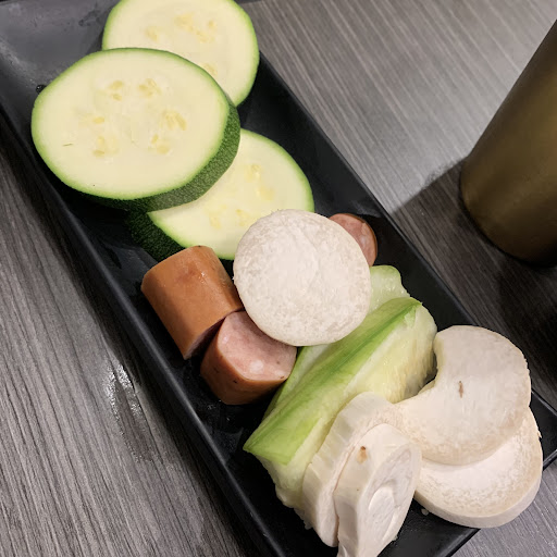 菜盤有杏鮑菇、絲瓜、德國小香腸、節瓜,還有生菜跟柚子蘿蔔;個人對節瓜比較挑食,覺得節瓜選得不太好(選太大條了,節瓜細一點、然後15cm左右的比較幼跟好吃)