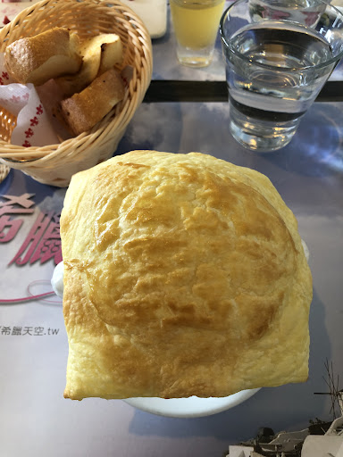Read more因為築間跟燒肉都沒位置 3大1小 朋友有帶小孩 決定就近吃飯 選了希臘天空的時候有點擔心很雷😂 但沒想到上餐速度快 且餐點好吃 雖然整體消費偏貴 但因為是假日又在海科館附近 就覺得也是合理 用餐時間兩小時 有兒童座椅 嬰兒車會店員代收放旁邊 每個人都會有蒜味麵包 像法國吐司 但很軟 蒜味很好吃😋 1.玉米濃湯+50酥皮:很推 濃湯奶味很重 酥皮好很吃 小朋友吃光光 大人也喜歡 海鮮清湯我喝覺得就還好 但朋友覺得可以 裏面有一隻蝦跟香菇 2.西班牙海鮮燉飯:蝦子新鮮 蛤仔沒有沙 很新鮮 只有花枝感覺普通 但燉飯很入味 味道很夠(以前在外面吃過西班牙燉飯很難吃的所以很擔心)還好這家還不錯👍🏻 3.煎雞肉燉飯:煎雞肉偏乾 沒有太老 但不夠嫩 燉飯沒什麼味道 節瓜也是沒味道 不太推 4.提拉米蘇:本來也沒期望觀光區的提拉米蘇 但沒想到很濃 第一口也有吃到一點點咖啡酒味 整體不錯 不會太甜 但上面的手指餅乾就不要吃了 小朋友不愛 5.香草冰淇淋鬆餅:香草冰淇淋太甜 巧克力醬跟巧克力米 也好甜😂 我們單吃鬆餅而已 因為朋友也不想讓小朋友吃太甜的巧克力或甜點 小時候吃太多糖分可能會影響腦部發育 單吃鬆餅很好吃 不會太甜 外酥內軟 是很鬆的那種口感 不是紮實的那種 但很好吃😋 6.烤羊排:朋友跟小孩吃得很開心 說不錯 我不敢吃羊 就不評論了 烤羊排前菜有多一顆焗烤扇貝(應該是扇貝吧 還是生蠔🦪😂 不知道