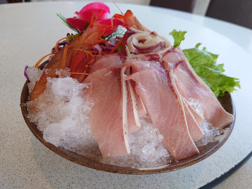 當時才剛上前菜--涼拌河豚皮,使用的是無毒的刺河豚(刺魨),得要一根根地拔除皮上的刺,算是功夫菜。涼拌後口感Q彈,滿滿的膠原蛋白,不過辣根和辛香料的味道比較重,兒童的接受度會比較低,算是大人的風味。果然除了兩位男士分走了一半,巨乳眼鏡美艷人妻和兩位美少女只是淺嘗,孤獨的美食家當然不客氣地下肚為安。