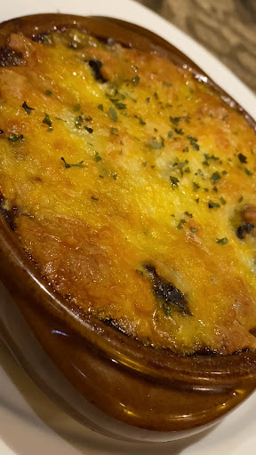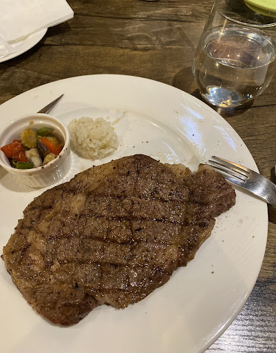 Read moreㄧ進店裡,頭上的水晶燈,復古雕花的座椅,牆上的風景油畫,一種久違的「西餐廳」氛圍,令人想起年輕時吃西餐約會的感覺。 雖然是中價位的牛排店,但餐點的品質,服務的態度,都非常有水準,是一家值得專程到訪的店。店內的低消是每人一客套餐,所以我們選擇紐約客牛排和紐約客加雞排的雙拼套餐。 首先上做的是沙拉,精緻小巧的沙拉提供開胃,令人驚艷的是加價50元的酥皮濃湯,酥皮烤得金黃酥脆(很多牛排館的酥皮不是烤得太焦,就是隨便烤一烤,沒有酥脆的口感),濃湯料多味美,應該是我近期吃到最滿意的酥皮濃湯了。餐前麵包,雖然只是簡單的蒜香,但蒜香醬煮得非常的均勻,不會太厚也不會沒味道,而且也烤得恰到好處,從這些小細節,就可以看出這家店的用心。 牛排5分熟,煎得恰到好處,但最特別的是旁邊的配菜,很有台式牛排館的感覺,炒飯搭配炒高麗菜、秋葵、蓮藕、香菇,還有蒜頭,吃起來竟然沒有違和感,還意外的美味。雙拼的雞排雞皮也是非常金黃酥脆,很推薦大胃王的人一定要加點。 後面的飲料醋,也是夠酸夠濃,底下的兩顆醃漬梅子,最後也一起吃掉,非常美味! 總之這是一家,我覺得水準非常高、非常用心,而且服務非常親切的「牛排...