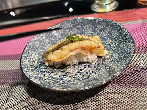 當天菜單:蒜香麵包、湯品(蛤蜊濃湯)、海螺、鮭魚卵生蠔、乾煎馬頭魚、蟹膏鮮蝦握壽司(熱飯)、干貝+鮑魚、主食、龍蝦、飲料、甜品