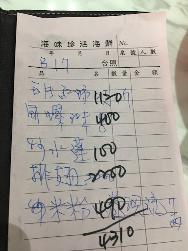 以菜色口味而論,海味珍具有餐廳的水準不容置疑。但若以性價比而論,有些菜色真的貴到有點離譜。我所貼的照片中的明蝦,單價一隻要260。還有一道港式蝦餅,像台式燒餅裡面加一點點蝦肉,一片大概兩隻手指的長寬,單片要價$70,貴到有點離譜!...另外還有20片的綜合生魚片,要價1400....而這些都是菜單裡面沒有寫價錢的。