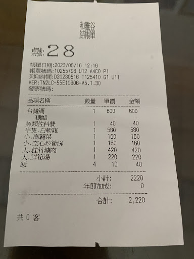 用餐席間~~~ 服務人員送結帳單過來⋯ 我看了一下內容,發現,竹筍湯$220沒幫我退掉耶? 我馬上到櫃檯詢問,櫃檯小姐回:沒關係,帳單如果有問題,待會結帳的時候,我們再幫你看 ~~~~ 餐後,拿起帳單到櫃檯,準備結帳,結果,櫃檯小姐,換了一張新帳單給我(我以為是扣除完竹筍湯後的新帳單) 我看了一下,以為自己眼花 再看一眼 第一次帳單$2220,筍湯$220 第二次帳單$2370 我:請問,筍湯扣除,不是應該就$2000嗎 櫃檯:我們台灣鯛的價錢,電腦設定,都是直接先設定$600 最後是看魚多重,才會再修改一次帳單價錢 嗯⋯ 第一張帳單,台灣鯛$600 第二張帳單,台灣鯛$970 嗯⋯(莫非,這是一隻偽裝成台灣鯛的鱘龍魚)