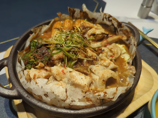 今天我點的是:“海鮮總匯”(原味椒鹽口味),學弟點的是:‘’在地放養土雞(秘制麻辣口味)‘’,都非常地好吃,“海鮮總匯”裡面有鮭魚、草蝦、干貝、蛤蜊、小卷,店家端上桌把紙包割開的時候,海鮮料理的香氣撲鼻而來,想要拿手機拍照,一下子就被滿滿的熱氣圍住,第一口先偷吃鮭魚,很鮮嫩耶,再偷吃一口下面的蔬菜,超級厲害,除了還保有蔬菜清脆的口感外,蔬菜吃下去之後會很震驚,原來上面這些鋪滿的海鮮料的原汁都滲進去這些蔬菜裡面,非常的好吃,干貝也是鮮嫩有汁,蝦跟蛤蜊也是鮮味滿滿,非常好吃。