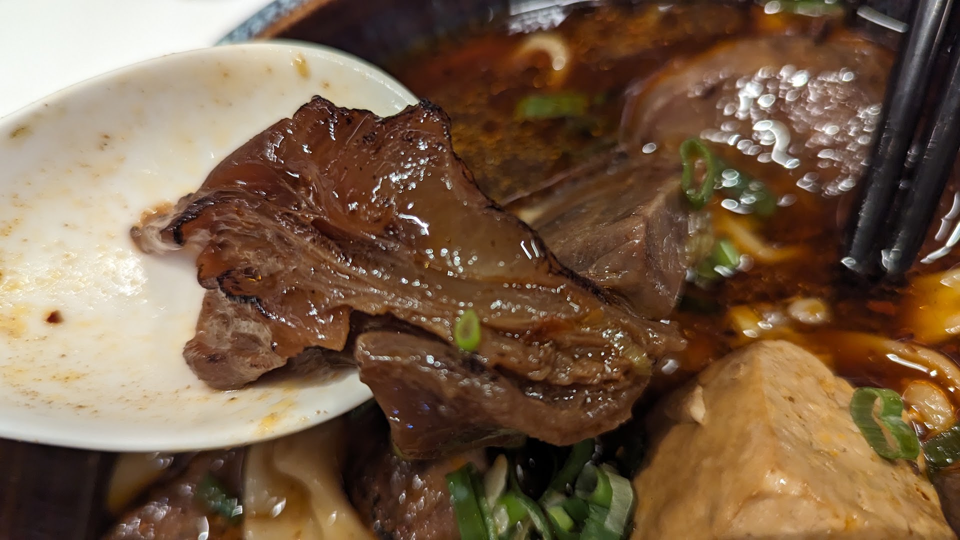 Read moreA modern beef noodle shop decorated with many figurines, showing owner’s interests. High ceiling dinning area, tasteful utensils used. Ordered normal beef soup with added tendons and tongue for wifey. I upgraded mine to 500 TWD milky spicy soup noodle, added tendons & stomach. Also ordered a side spicy pig’s intestine - so yummy! 500TWD came with dedicated truffle dipping sauce for the medium well US prime ribs. Great bowls of beef noodles. A must visit in Yilan/Luodong area. Best to...