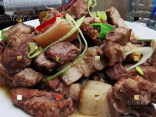 澎湖的"紅燒肉"絕對是不一樣的,"紅燒鮖鮔滷肉"是早期的作法,早年的澎湖沒有冰箱大部分的海鮮都是用醃製或曬的方式來保留,醃製過拌炒後的鮖鮔香而不膩,口感有彈性帶有鹹香味,而澎湖特有種鮖鮔又名真蛸屬章魚的一種,體型較大觸腳較粗短俗名石巨,一般在家的話紅燒肉或是排骨可與其一同燉煮。這的醬油香氣沒有台灣的那麼重,反倒是帶有經陽光曝曬過的章魚散發出乾料的濃縮海味,這海味與五花肉融合在一起,味道極為特殊,燉的軟爛的五花肉跟軟Q的章魚腳一起咀嚼,這風味記憶深刻啊,所以紅燒石鮔滷肉不僅有故事也保有早期的原味。 "乾煎砲彈魚",端上來時那兩大片還誤以為是土魠魚,"砲彈魚"在台灣則從未見過,正值產季的砲彈魚新鮮好吃,魚身的紅肉與白肉風味各異,紅肉口味有如牛肉般的厚實,白肉有如土魠魚般的好吃,這餐又學到新的海鮮知識了。