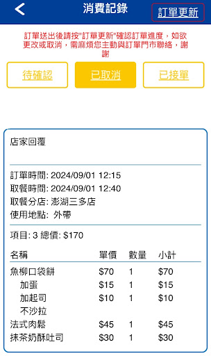 最後金額多算我真的不懂,我就是去反應說價格不一樣被多收錢,然後店員回覆說菜單價格是舊的,阿你在那跟我說系統有打9.5折??? 才不是在說折扣,是被多收錢,而且我反應了啊,店員回菜單沒更新,所以消費者只能吞阿。 再來,根據“被取消”的訂單截圖,哪有什麼9.5折???? 阿,我懂了,要線上訂餐成功才有折扣哦~ ...