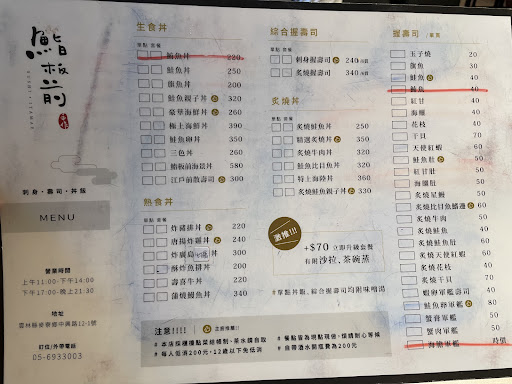 中午太熱,冷氣不夠涼建議店家可以早點開冷氣開店前就開好預冷或調大風量,客人怕熱建議晚上再來用餐 簾子也可以早點放下來(十一點左右)不管是為了吸引客人還是什麼原因,別讓陽光影響正在用餐的客人,這樣我覺得本末倒置。 生魚片的部分建議上面也鋪一層碎冰再上菜讓生魚片口感更佳。 茶碗蒸還不錯,蒸蛋的水可以加點柴魚煮再蒸味道更足。 餐點備料部分需再加強,可在試營運期間觀察客流量來備料 味增湯很糟糕,不管是味增、高湯、鮭魚都沒味道 當天點了烤魚很好吃!