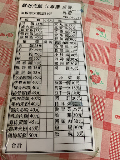 但江麻攤非常經濟實惠地拯救許多困苦潦倒ㄉ放蕩大學生,無數個夜晚裡,我和朋友在苗栗街頭騎車遊蕩,苦苦尋覓拯救我們的一餐,而有道光穿透白霧還有路燈還有招牌燈(還有亂騎車的三寶)指引我們人生的方向,是他,江麻攤,我們的大哥,讓我們不再飢餓,只要35元的排骨飯,有澱粉有蛋白質有菜,讓我非常快樂(我的錢包也很快樂)鴨肉飯也讚我的愛!餛飩湯讚!