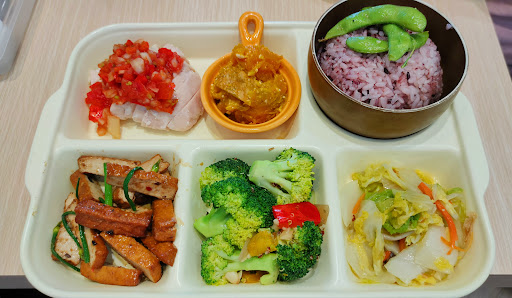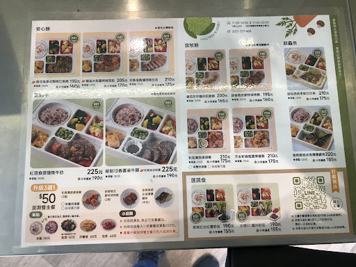 店家主餐主要以豬、牛、雞、魚為主!每份餐點可以選三樣配菜、另附一道涼伴菜與紫米飯👍👍外帶則會便宜35元/份,另外還有蔬食選項,可惜配菜就不是素食(有放蔥薑蒜),如果有素食配菜的話,一定可以吸引更多的人到訪吧!!