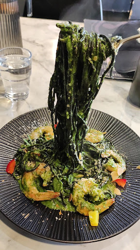 青醬鮮蝦麵🦐:青醬的味道一開始吃覺得有點不太夠味,後來就還好了,香料有加甜羅勒(菜單上有寫),吃的時候會有一點甜甜的香氣,蝦子好吃,蠻新鮮的