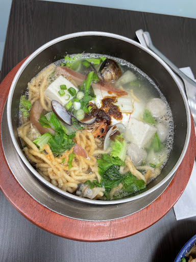 Read more首次拜訪,點了牛奶起司湯麵換飯跟海南雞飯。 賣像都很好看,沒拍到照片有點可惜(下次拜訪再拍)。 湯飯蠻好吃的。湯奶味濃郁很順口不死鹹,湯裡的配料也很多,有蛤蜊(超級多!)、肉片、高麗菜、一些火鍋料及蛋等等,一個迷你小火鍋的概念,價格百元有找,CP值很高,湯配飯完全足夠會有飽足感。 但是!!如果要嚐鮮海南雞飯不推薦。(除非真的很想吃) 海南雞飯是以便當的形式推出,配菜只有芹菜、醃蘿蔔、醃漬小物,以便當來說有點失望。至於海南雞,上面鋪滿鹽蔥醬,配上去入口滑順,雞肉軟嫩。醬裡帶有蒜頭,不愛蒜味的可以撥到一旁,但單吃雞肉雖有一些醬殘餘卻又有些寡淡,遠遠比不上整塊雞肉滿滿蔥鹽的大口吃下.... 整體來說,是可以二訪,但店家主打的便當類不會再點,但會...