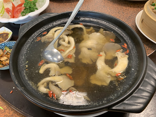 Read more當一群天龍國的歪嘴雞,被帶到一棟公寓二樓,實在不起眼擺盤很弱又無菜單的餐廳。第一道竟然上鴨湯,正傻眼心中狐疑時,一道道驚豔不已新鮮食材的菜送上來。中場休息時,我請服務生看老闆或大廚可否上來說菜一下。 原來第一道是熬了八個小時的「紅麴芋頭養生鴨煲湯」濃郁卻完全吃不出芋頭的沙感。 不是糯米、不是糯米、不是糯米,是「在來米」生炒熟的櫻花蝦米飯,灑上客家菜常見的生韭菜,粒粒分明不油膩 活跳跳龍蝦略炒的粿仔條,蝦肉還透嫩到可以沾芥末醬 生蠔怕長輩不好吞,滾水快速川燙過冰,實在鮮美意猶未盡 避風塘炒三點蟹、龍膽石班魚破布子、干貝蛤蜊雞湯、絲瓜九孔扇貝,三蛋菠菜,最後甜點竟然是冷凍的烤地瓜,不是冰的是冷凍的⋯太神奇。 這桌菜在台北沒有萬以上是吃不到的啦,實在是賓主盡歡! 老闆告知二十年都沒有菜單,我們是事先預約告知需求和預算。開心...