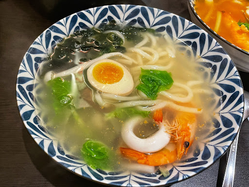 拉麵內容物: 新鮮大蝦x2 (1顆星)、青菜、糖心蛋半顆、魷魚圈、蛤蜊… 不得不說,料多且海鮮都蠻新鮮的、蝦子偏大隻,魷魚也Q彈 但糖心蛋我們覺得沒有讓我們想多加點的,正常表現沒驚豔 湯頭我們這些四位都各別點不同 因為我都喝完後,個人覺得泡菜味道相對比較沒特別 但是因為它的泡菜是另外附小碟裝的 所以湯頭偏清爽,這做法少見 泡菜對我少吃辣的人算是偏中辣以上 也在小菜的行列,有興趣的朋友可以試看看 他們是有另外賣,但我個人覺得不合我的味 愛辣一些泡菜的朋友,可以先吃看看再決定是否另外買 其他都算濃郁,連昆布味都蠻濃的