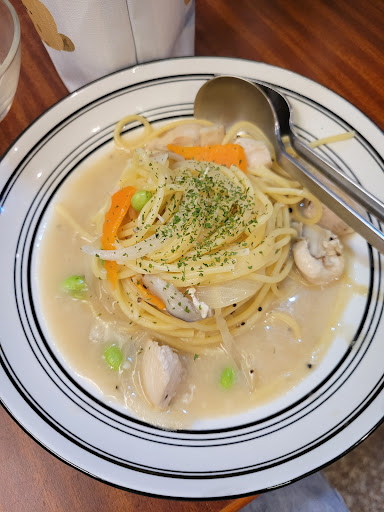 Read more1.不管哪款醬汁都很稀(照片是清炒不是白醬喔) 2.可以多麵但一般的份量就足夠了 3.料偏少(其他朋友的也都是毛豆、洋蔥、香菇) 4.麵體硬度剛好 5.醬料調味都偏甜 6.桌子沒擦,整個黏黏的 最後想建議店家: 要等很久的話可以先告知嗎?沒想過要等50分鐘欸,能理解晚餐時段人潮多但我也是第一次來,...