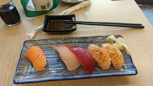 (附圖是已吃掉一貫鮭魚握的單點握壽司盤,最右邊兩貫是焦糖炙燒鮭魚握,比爭鮮好吃一萬......不,一億倍)