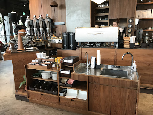 Very modern industrial on the inside, yet spacious and relaxed setting. There's seating on the platform, but there's a time limit there. If you want seating in the main room where there is no time limit (and plenty of charging stations), you might need to wait in line due to how busy the shop gets.
